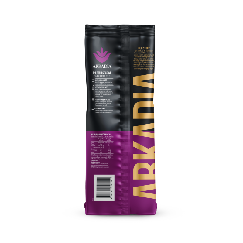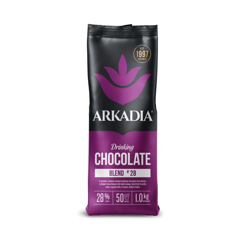Arkadia Drinking Chocolate 28% is a medium-bodied blend designed for those who want more depth in every cup. It delivers a rich cocoa hit balanced by subtle orange, dried fruit, and earthy notes. All rounded out with a buttery, creamy finish. Its layered flavour profile makes it a standout choice for cafés seeking a chocolate powder with complexity, while still remaining smooth and approachable for everyday drinkers.